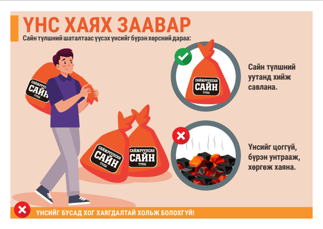 Сайн түлшний шаталтаас үүсэх үнсийг бүрэн хөрсний дараа: Cайн түлшний уутанд хийж үнсийг бусад хог