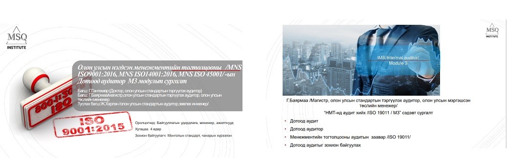Сургагч багш/ сургалтын байгууллага : Монголын стандарт, чанарын хүрээлэн (MSQI) Г.Гантөмөр (Доктор, олон улсын стандартын тэргүүлэх аудитор), Магистр Г.Баярмаа