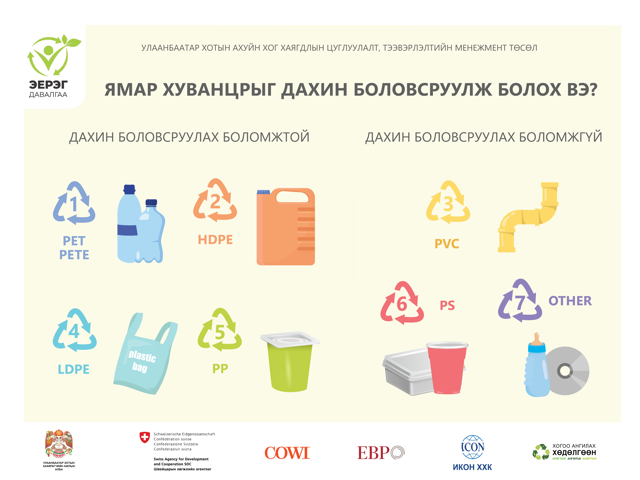 7 төрлийн хуванцраас дараах 4 төрлийг дахин боловсруулах боломжтой байдаг байна. Үүнд: