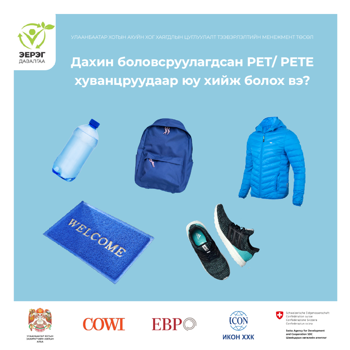 Дахин боловсруулагдсан PET/PETE хуванцарууд нь шинэ ундаа, усны савалгаа болон синтетик үүргэвч, куртик, хувцас г.м өргөн хэрэглээний бүтээгдэхүүн болдог байна.
